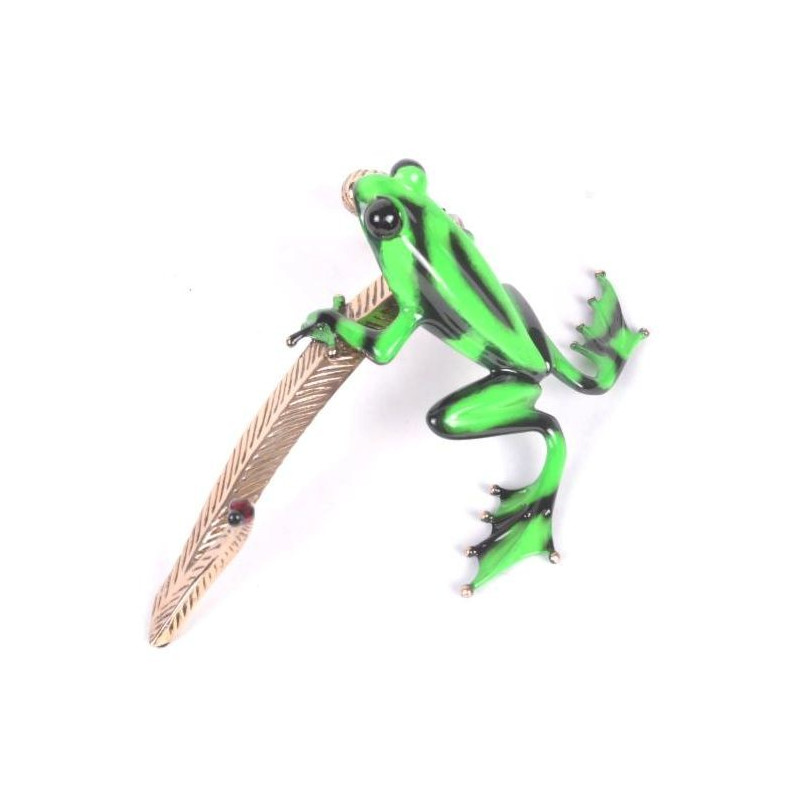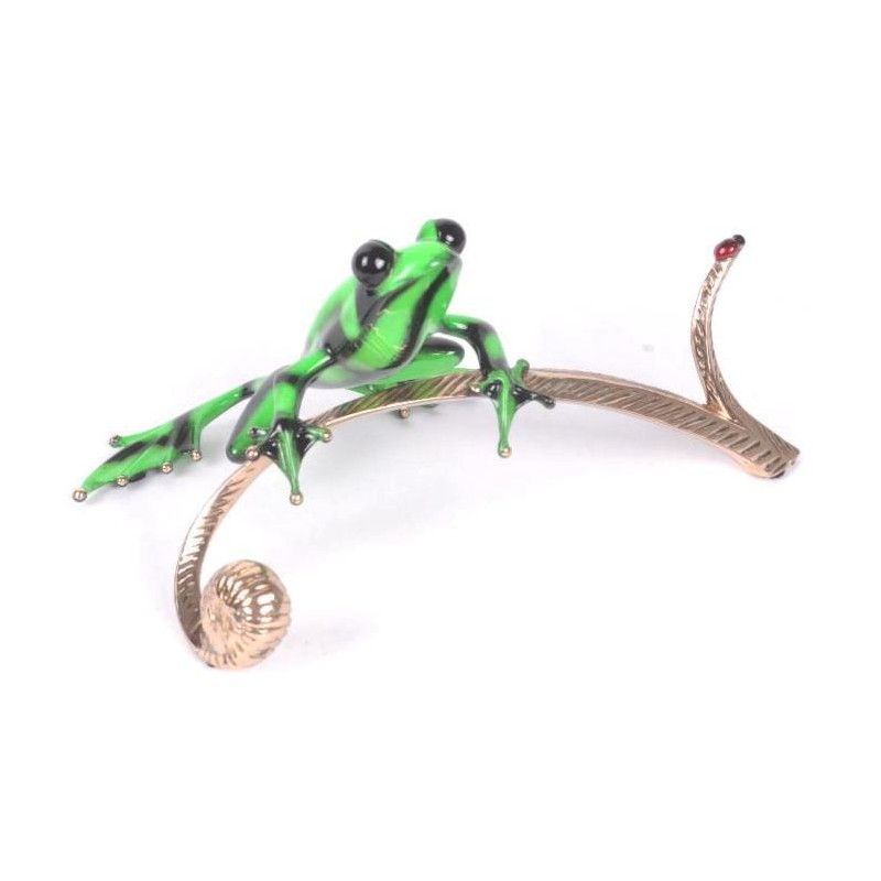 Dexter is the fifth in the celebrated “Wildside Series". The vivid lime green patina, randomly patterned with saturated black-toned markings, masterfully depicts the coloration of the Green and Black Poison Dart Frog. Leaning against a polished bronze reed is accompanied by the iconic Cotterill ladybug.
