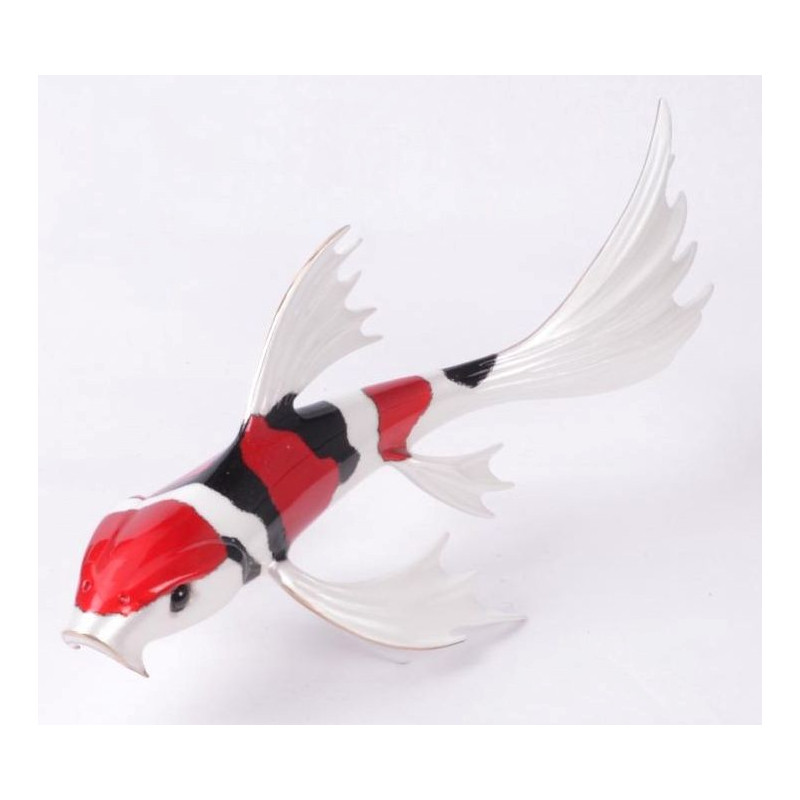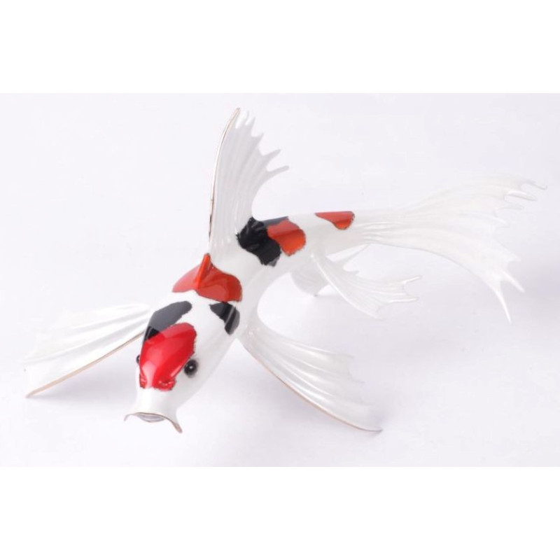 Deep crimson, inky black and copper toned stylized motifs provide a striking contrast to the pearlescent white bodies. The polished bronze fins catch the light, creating a glow and the suggestion of movement.
